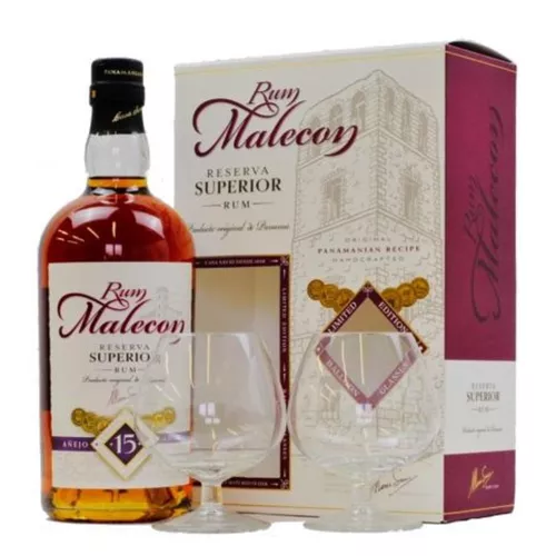 Malecon 15y je prémiový rum z Panamy zrající 15 let. Sada obsahuje dvě sklenice. Bohaté aroma sušeného ovoce, vanilky a koření, ideální pro znalce.